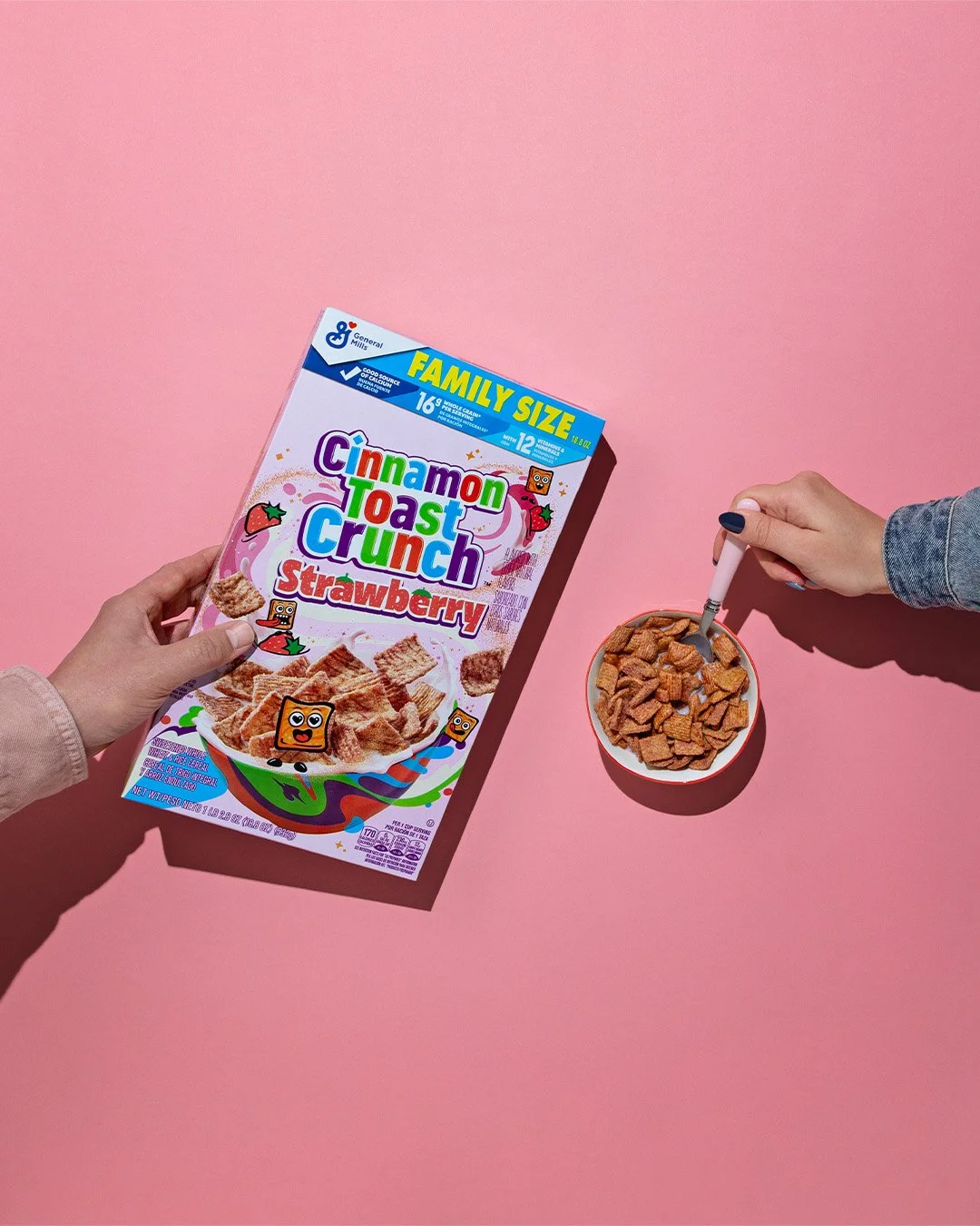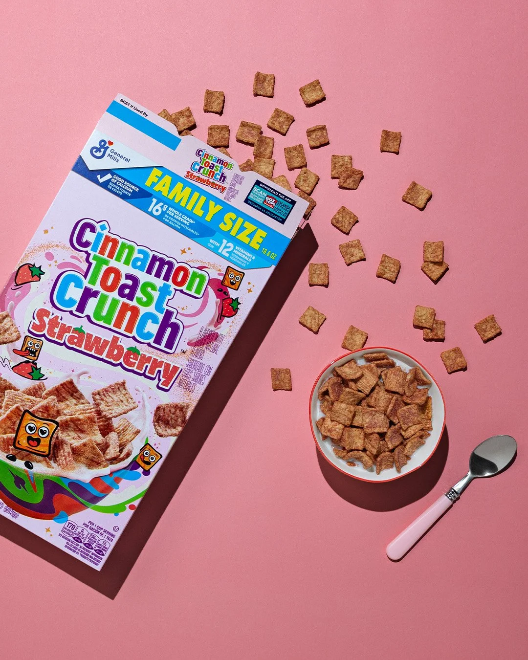 To make Cinnamon Toast Crunch’s iconic Cinna-dusted squares even more irresistible, they introduced a strawberry flavor — Bringing the playful pink box to life, we designed 2 sets that visually capture the essence of this sweet new twist.